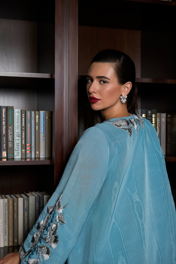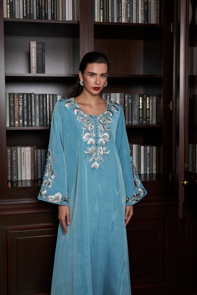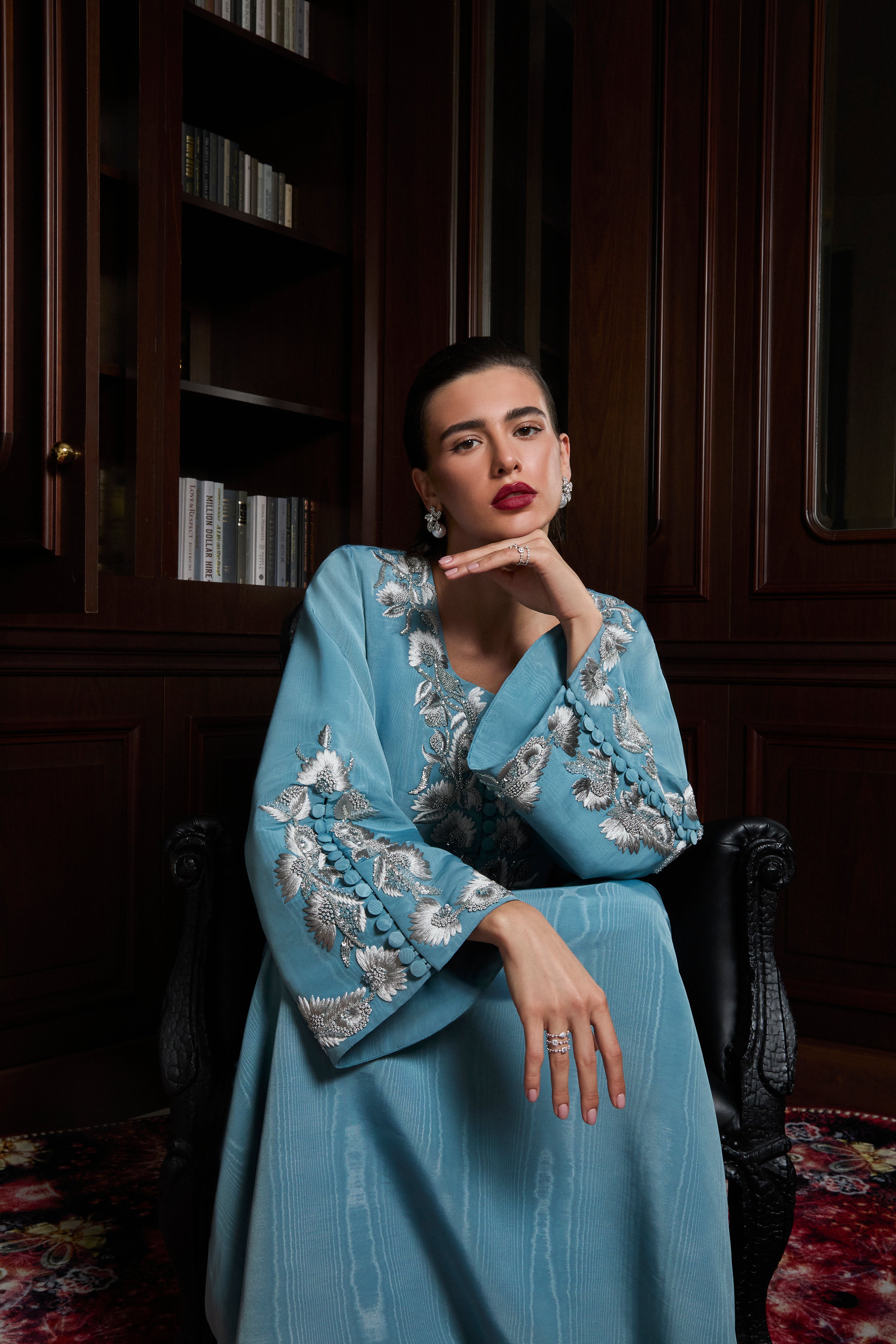 An elegant kaftan crafted from luxurious taffeta fabric, adorned with delicate hand embroidery and embellishments on the chest and sleeves. A timeless design that reflects refined taste, perfect for special occasions.