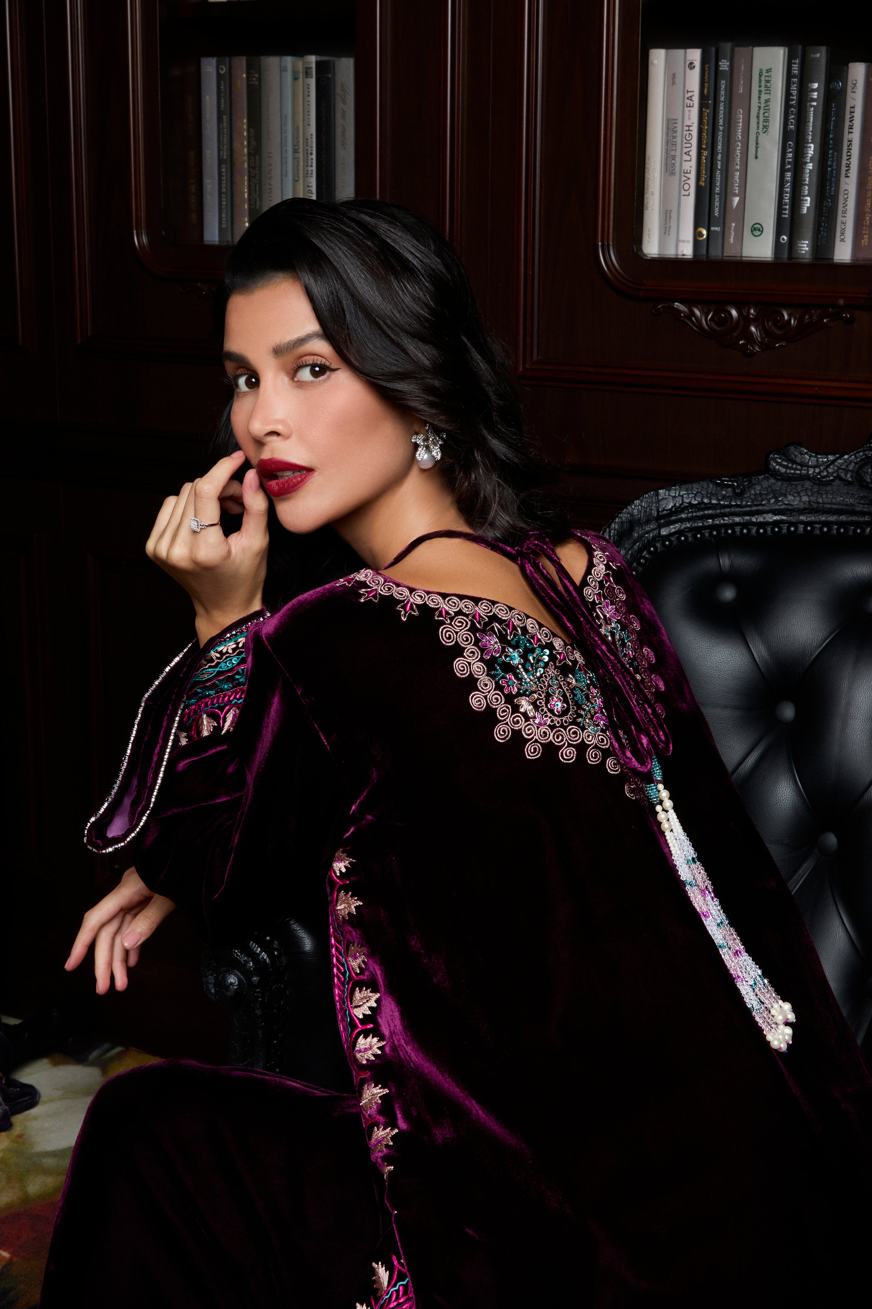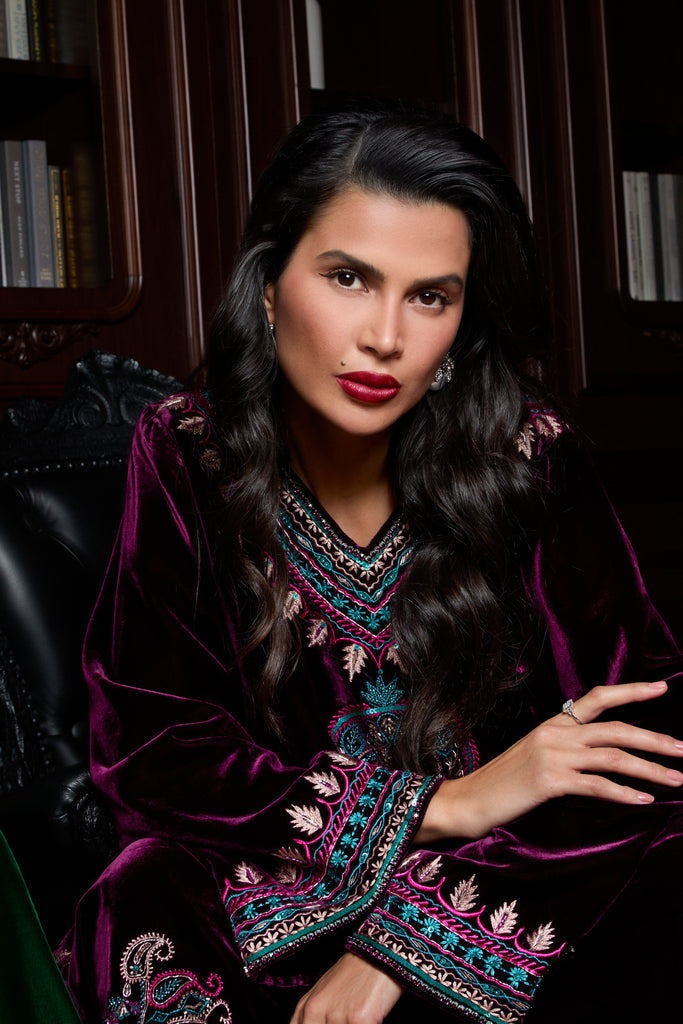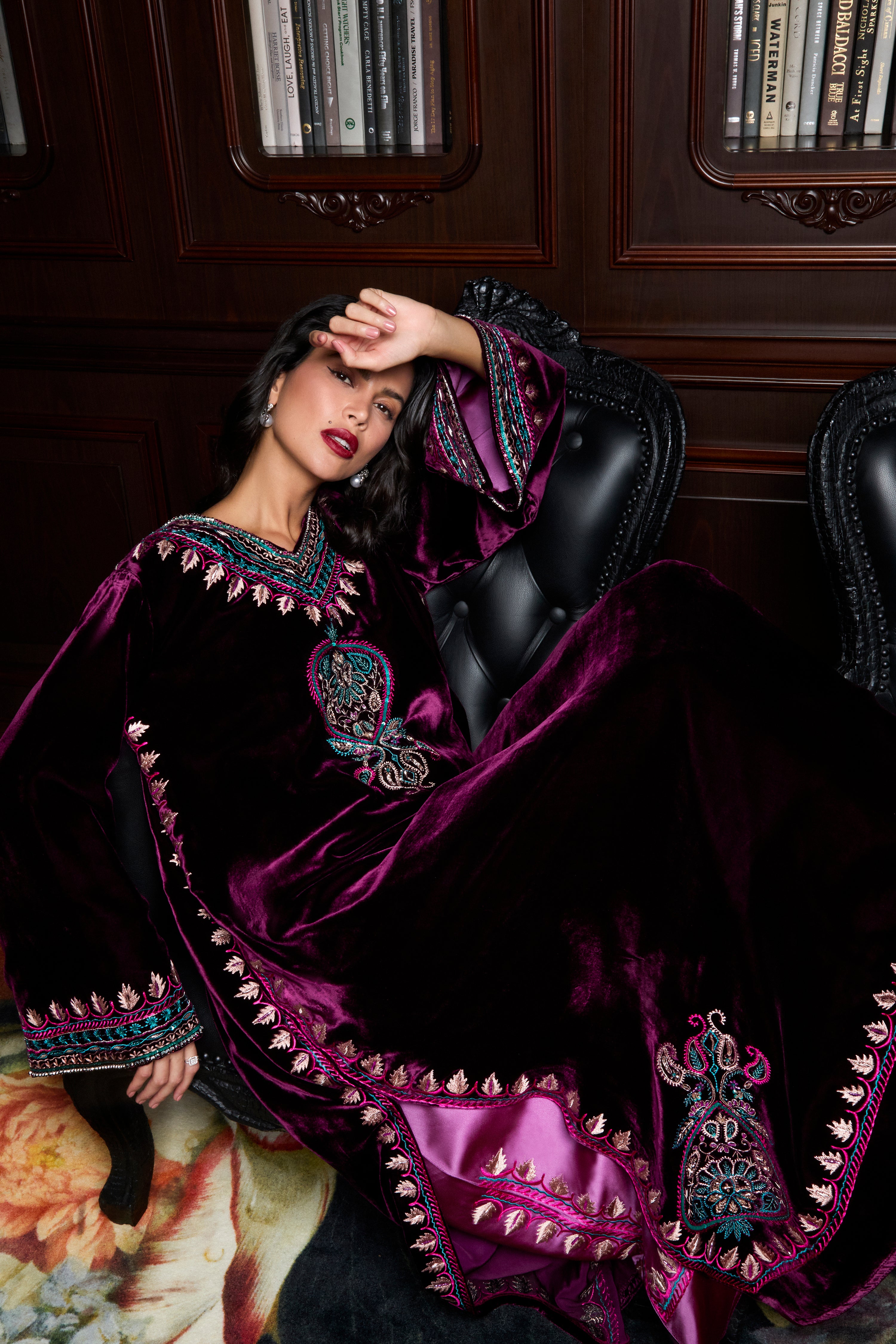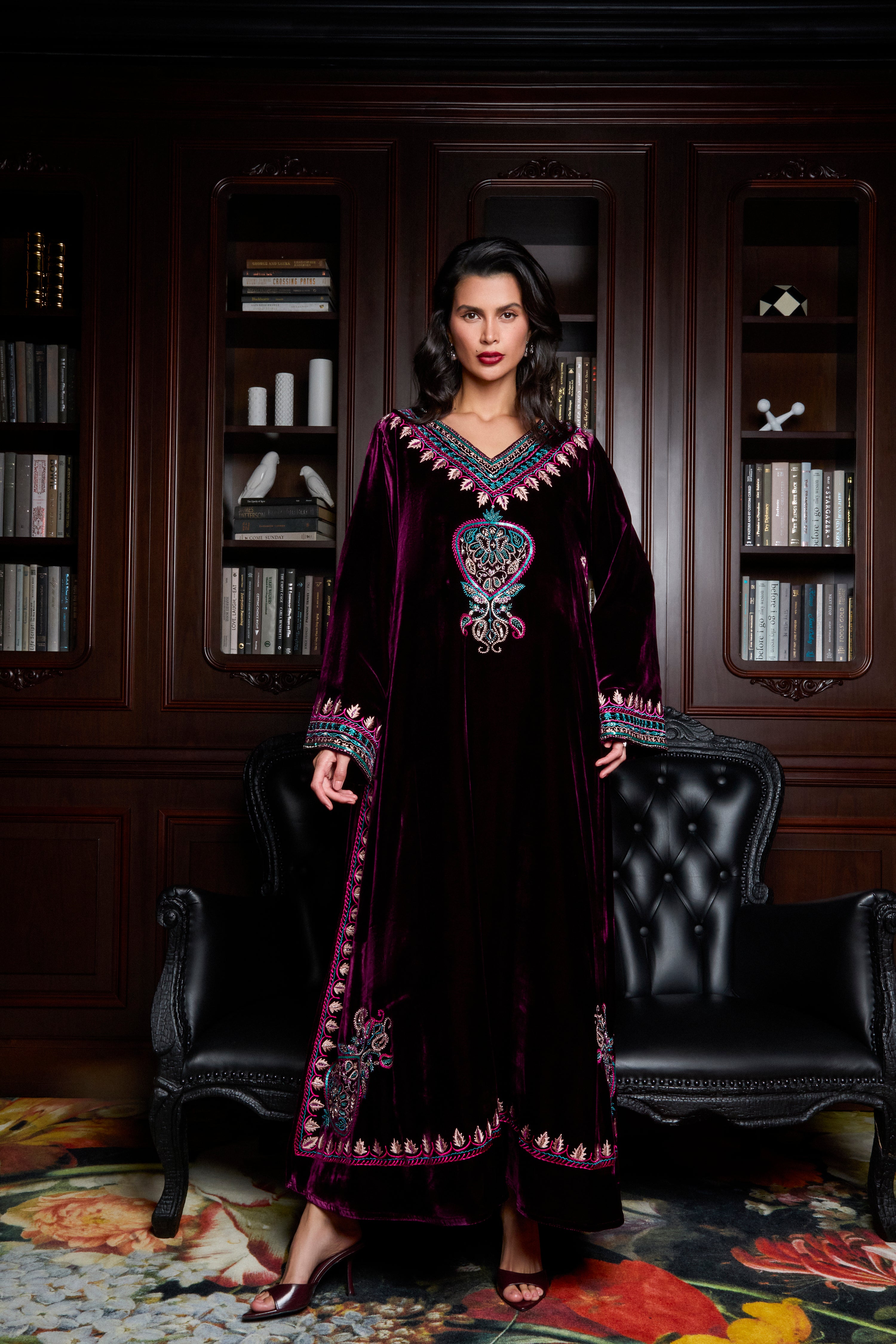 A luxurious velvet caftan in rich mauve, lined with elegant taffeta fabric. Adorned with exquisite multicolored hand embroidery and beadwork across the front, back, and sides, featuring a hand-embroidered tassel detail on the back for a truly regal finish.