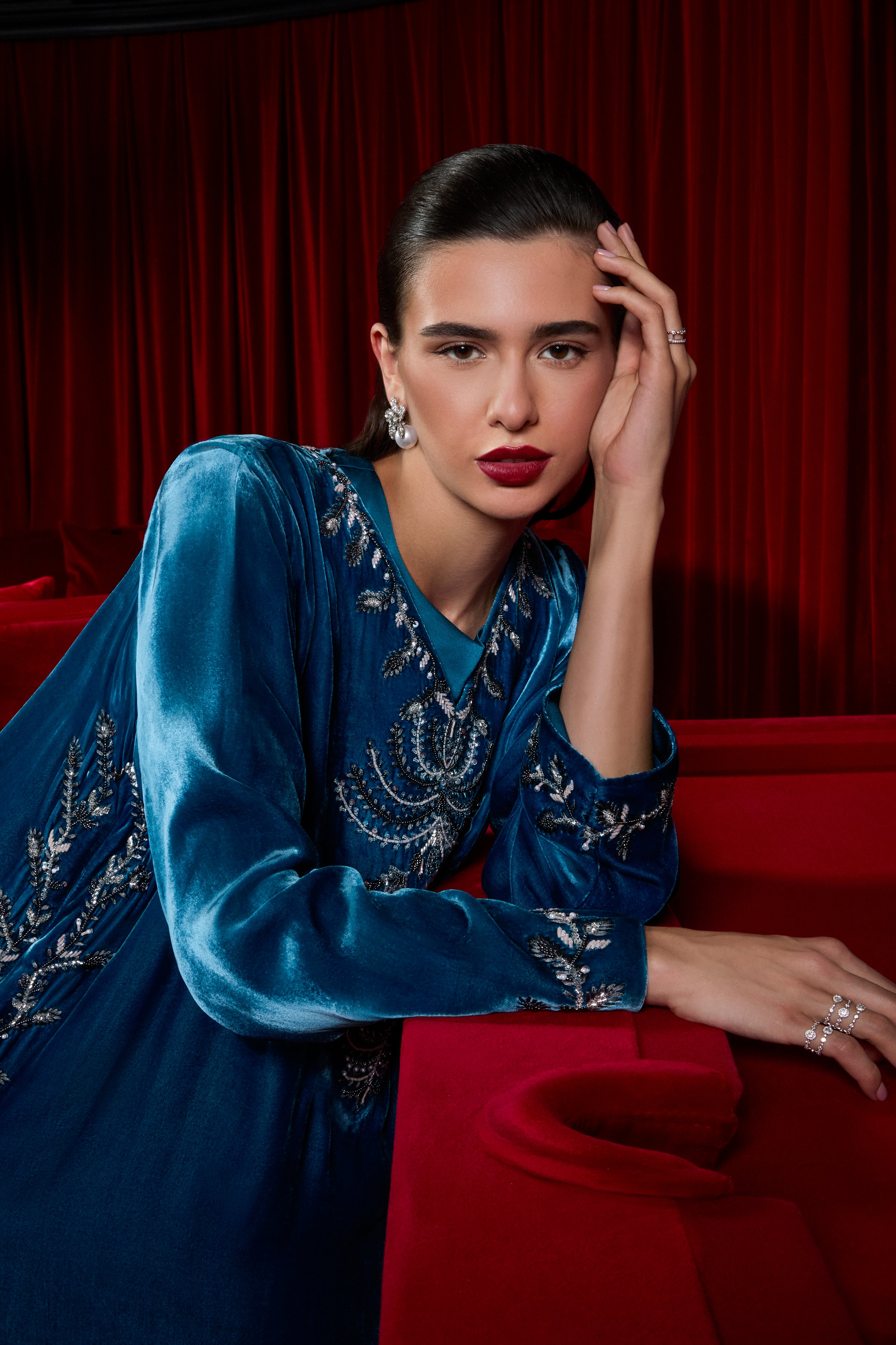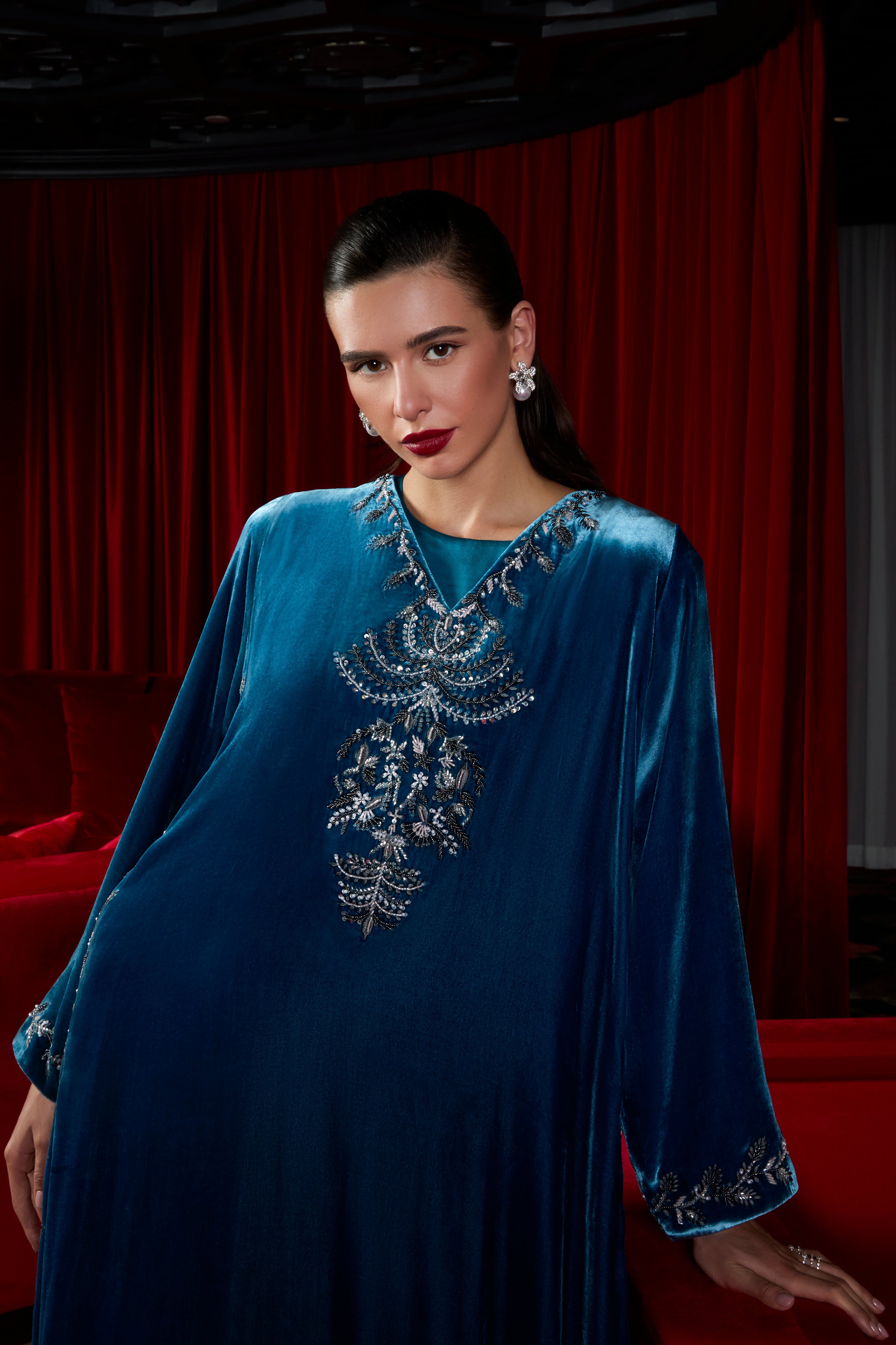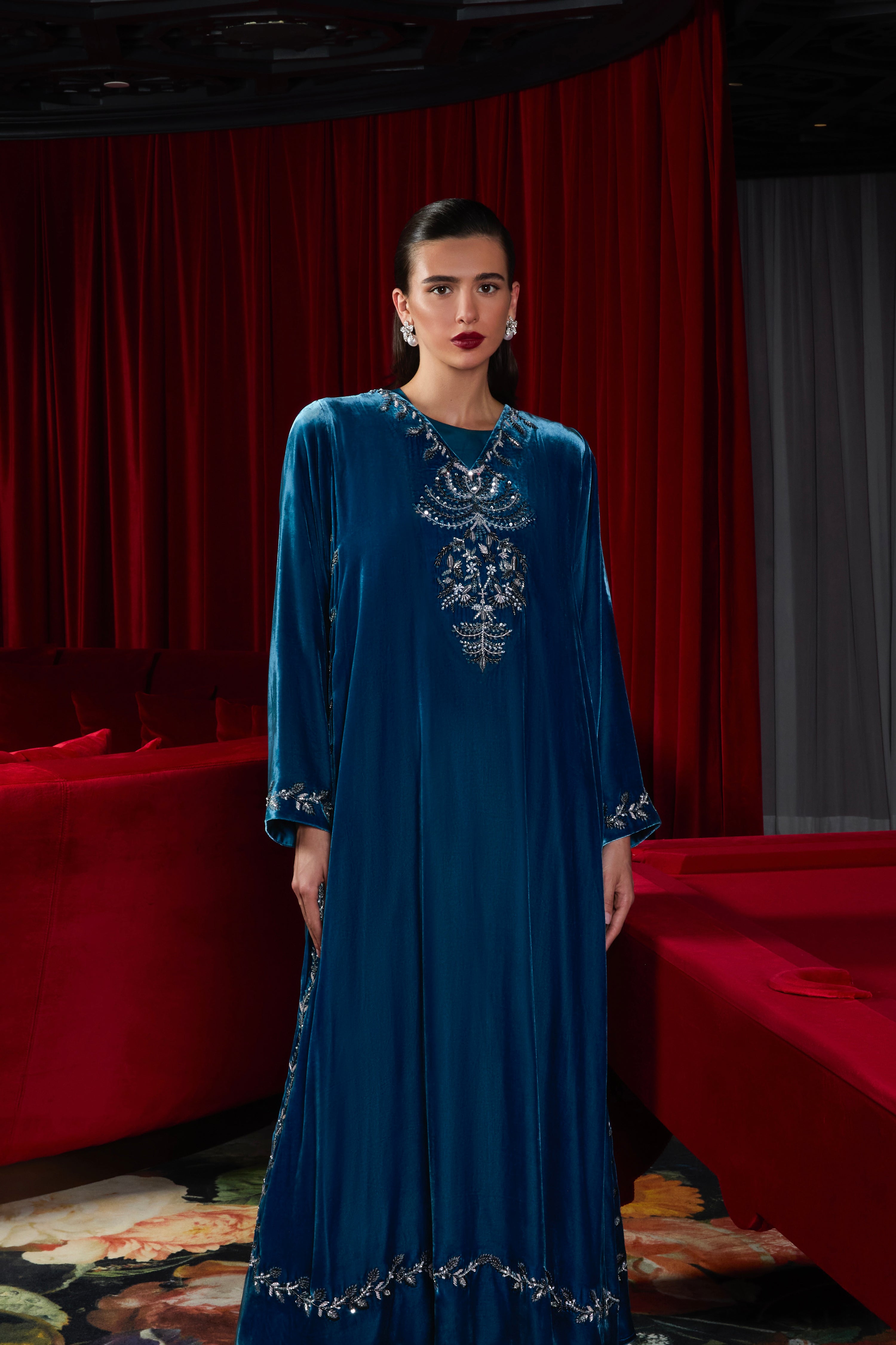 A royal kaftan in blue, crafted from luxurious velvet and adorned with intricate hand embellishments across the chest, sleeves, and sides. The design is elevated with an inner pleated silk dress in matching blue, adding depth and elegance to your look. A sophisticated piece made to stand out at special occasions.