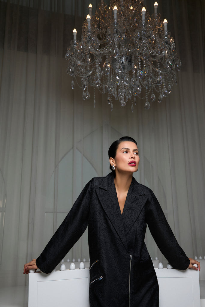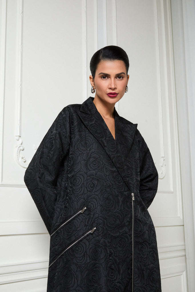 A blazer-style abaya crafted from luxurious floral jacquard fabric in black, featuring silver zippers on the front and sides for a modern yet refined touch, blending timeless elegance with contemporary edge.