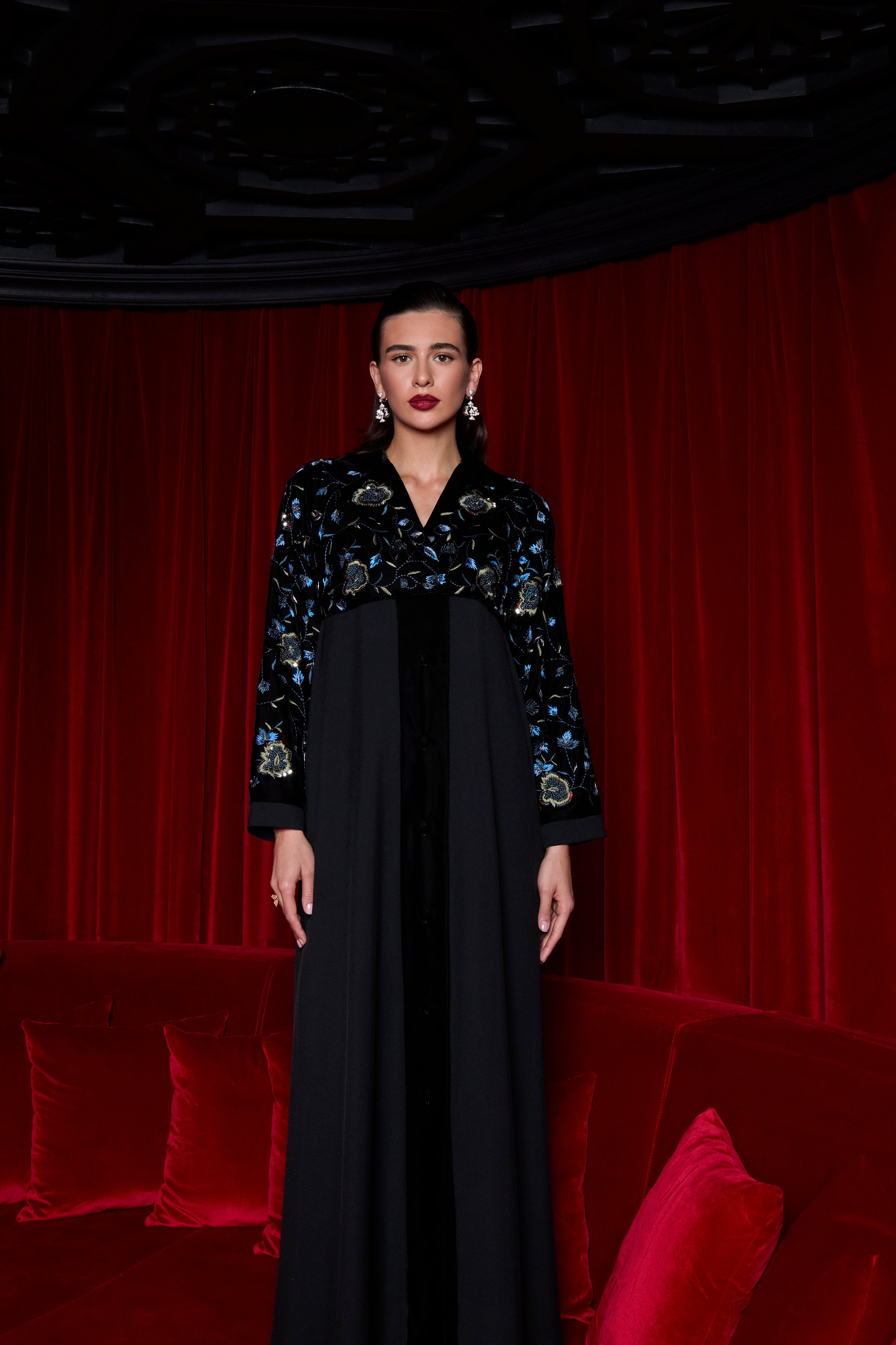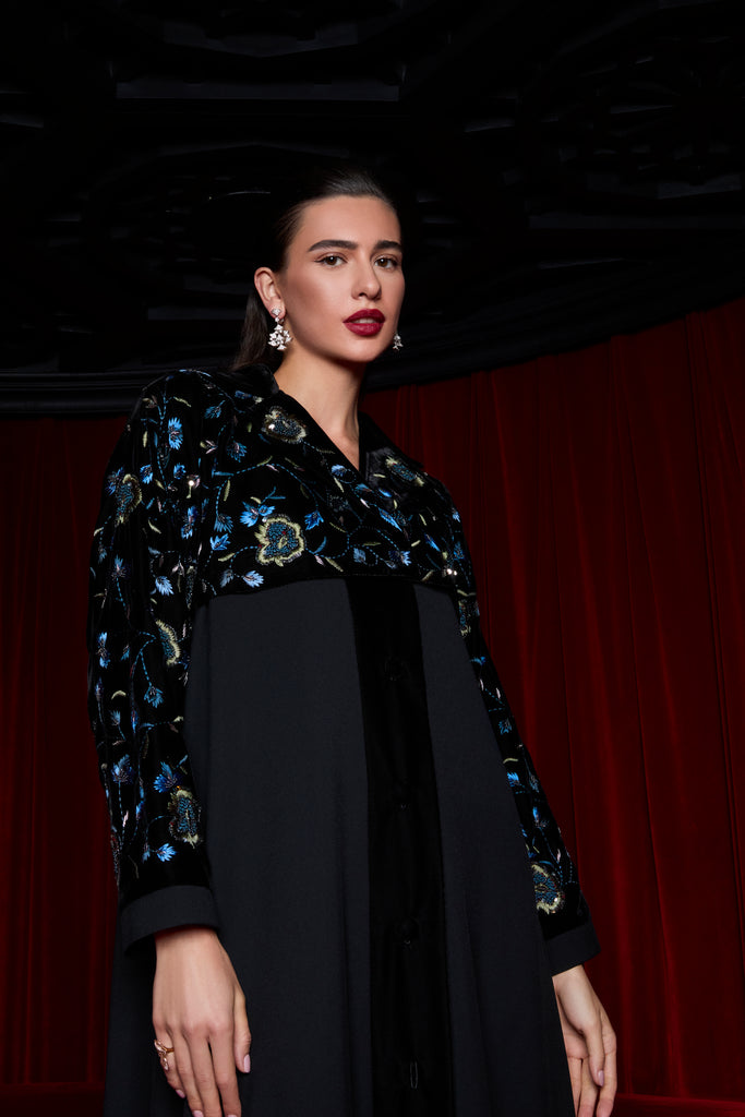 A luxurious abaya made from premium Japanese crepe, accented with black velvet fabric for depth and elegance. Adorned with hand embroidery and embellishments in blue and silver across the bodice and sleeves, this piece strikes a perfect balance of sophistication and glamour.