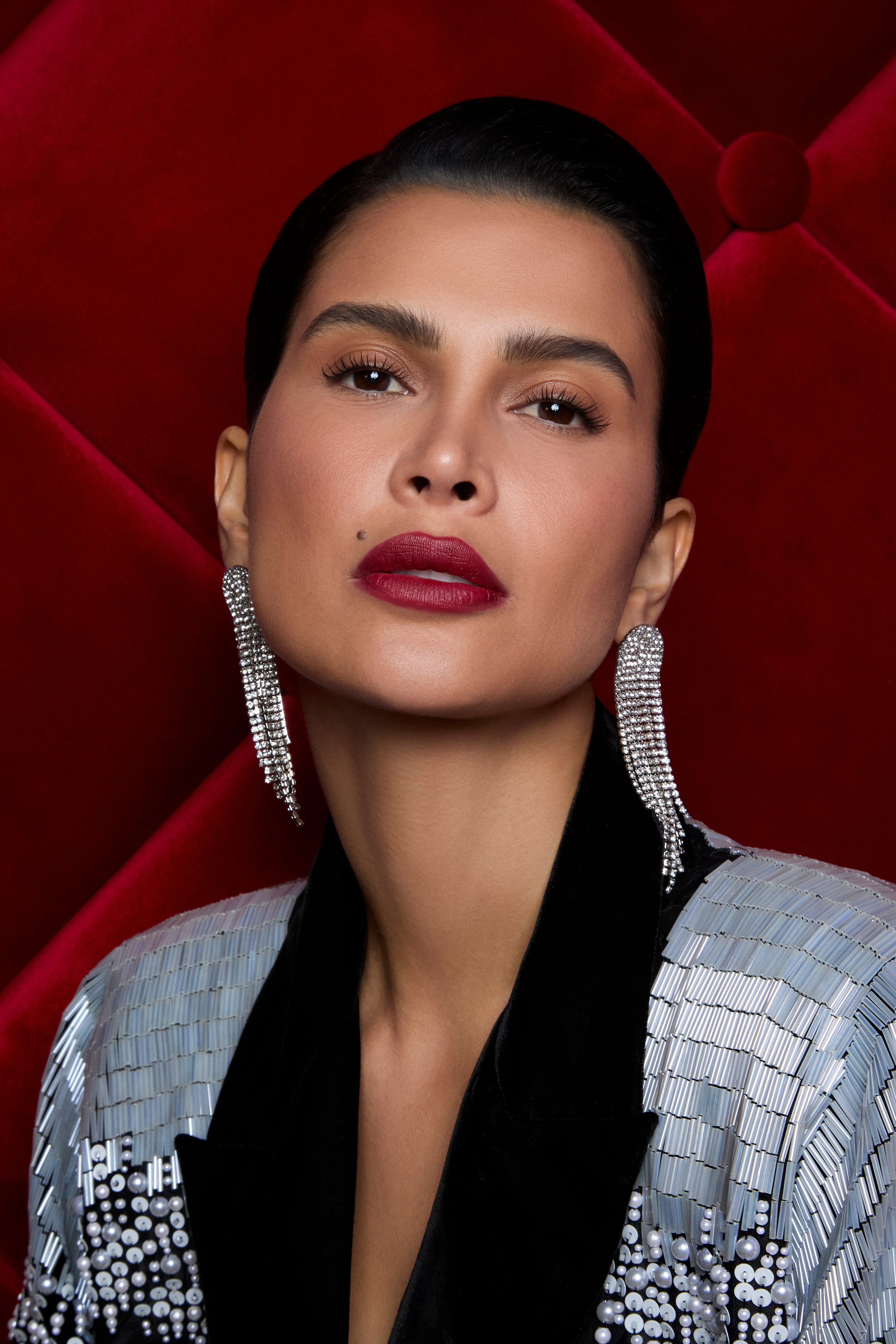 عباية فاخرة من قماش الجاكار المزخرف بتصميم أنيق يعكس الفخامة. يكتمل جمالها بأكمام وياقة من المخمل الأسود الراقي، وتزداد تميزًا بفضل الشك اليدوي الكامل على الأكتاف الذي يضفي لمسة لافتة من البريق والرقي.