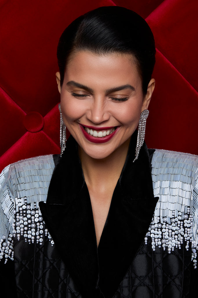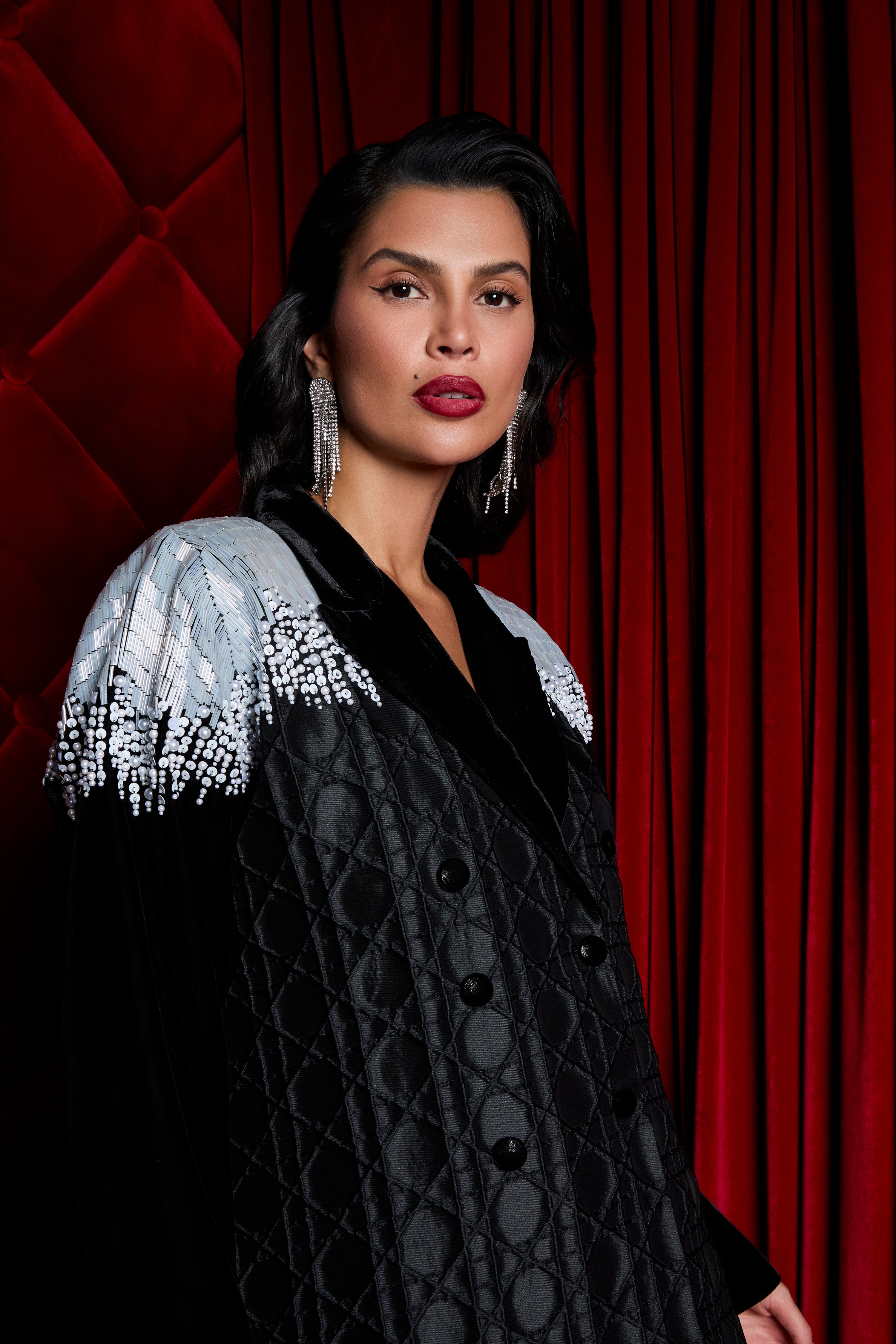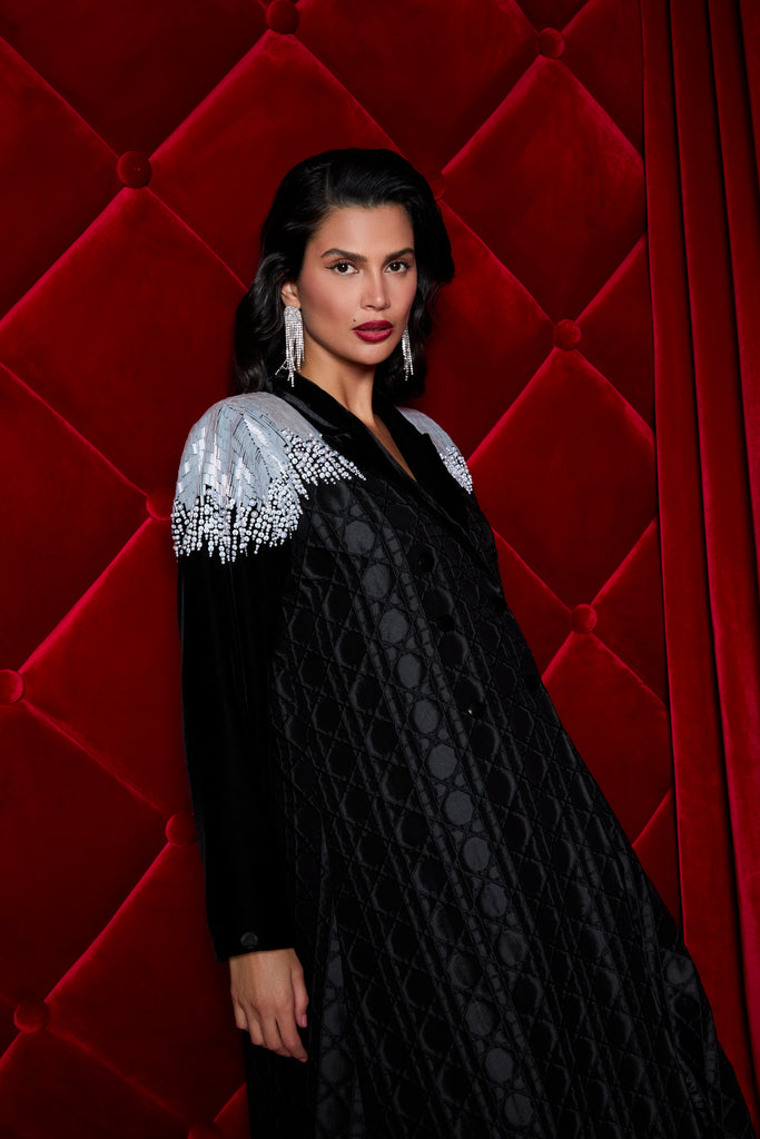 A luxurious abaya crafted from patterned jacquard fabric, exuding elegance and sophistication. Enhanced with black velvet sleeves and collar, and elevated by intricate full hand embellishments on the shoulders, this piece radiates timeless glamour.