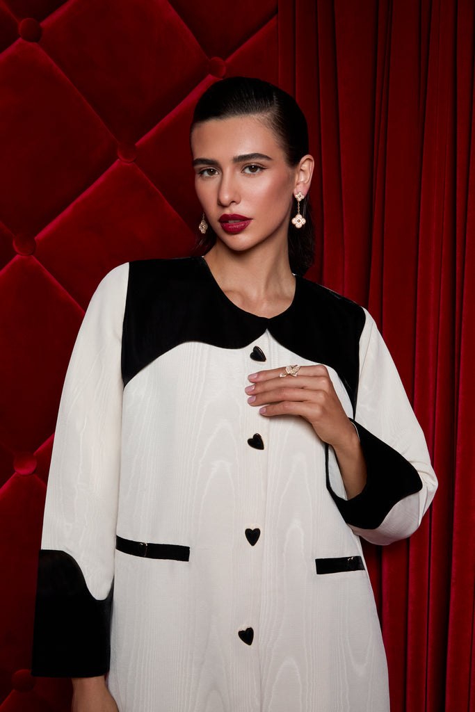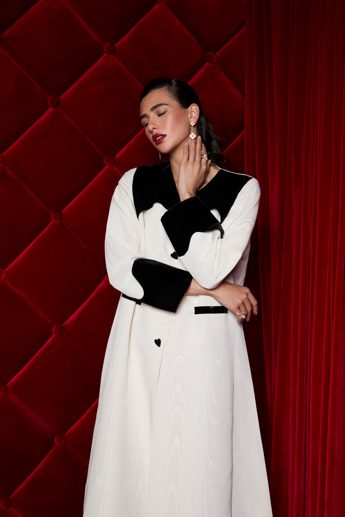 عباية أنيقة باللون الكريمي مصنوعة من قماش التافتا الفاخر مع تفاصيل من المخمل الأسود على الياقة والأكمام والجيوب. يزينها صف من الأزرار المخملية بشكل قلوب تضفي لمسة أنثوية مميزة تجمع بين الرقي والنعومة.