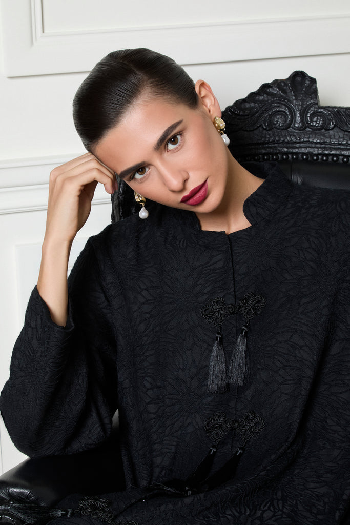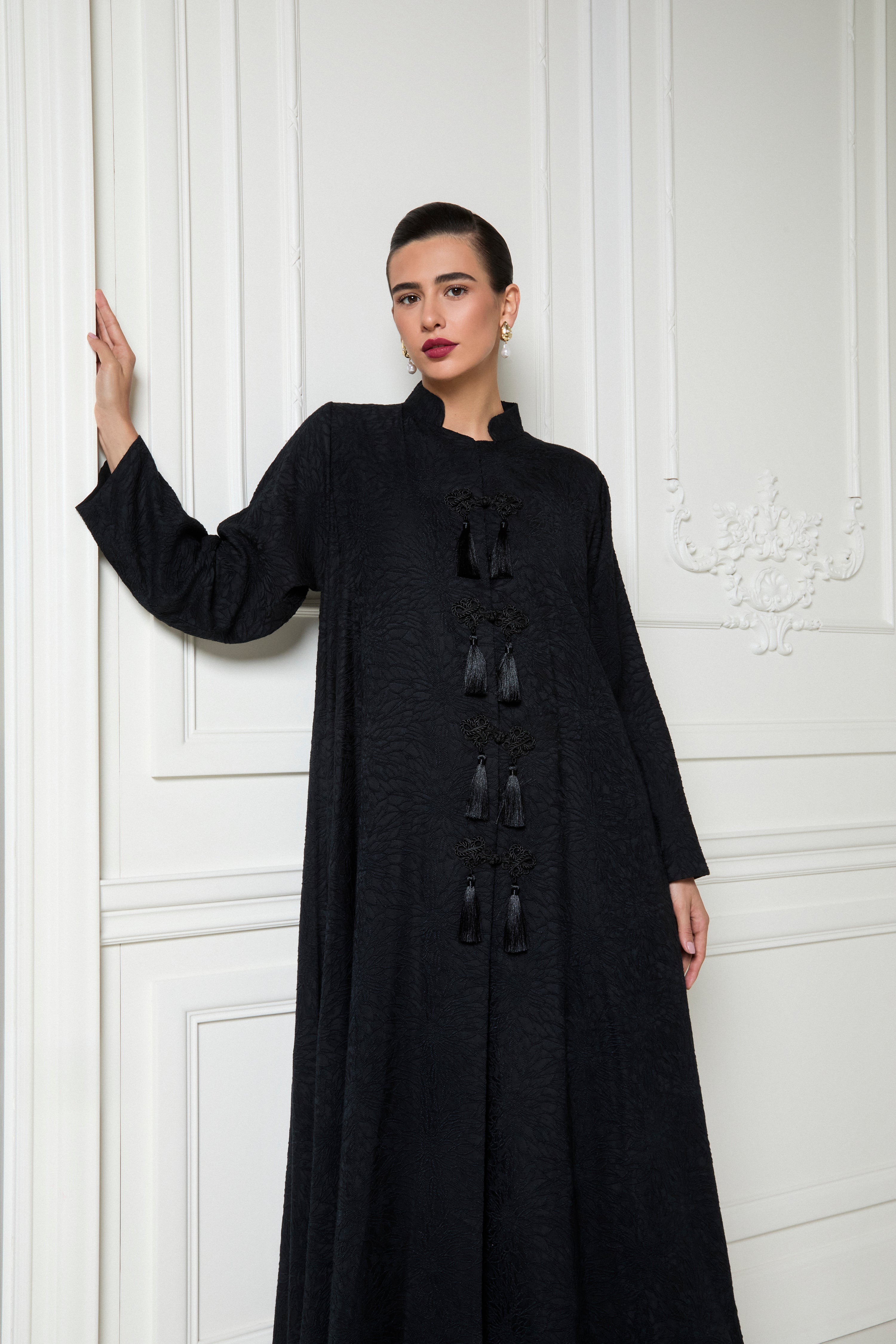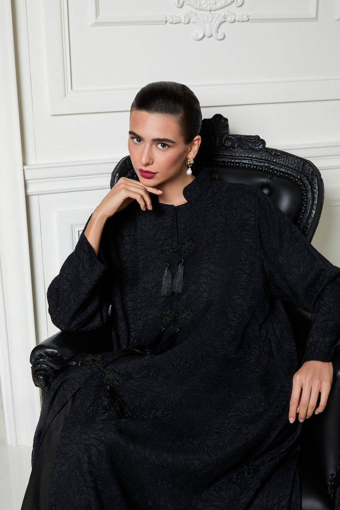 A sophisticated abaya crafted from black floral jacquard fabric, blending traditional charm with modern elegance. Adorned with Chinese-style buttons and tassels for a distinctive touch, and finished with a refined high collar that enhances its graceful appeal. A timeless piece of elegance in every detail.