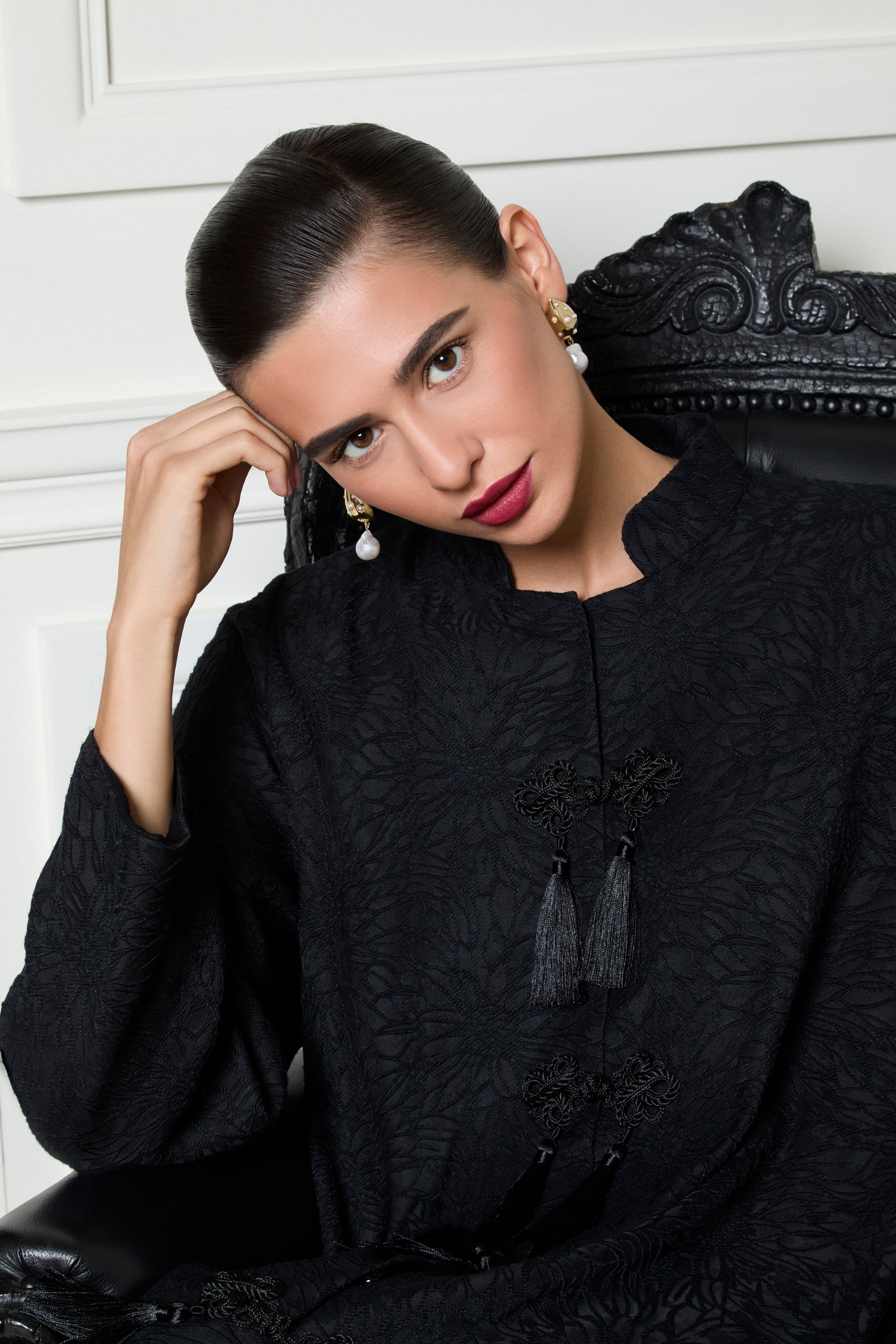 عباية أنيقة من قماش الجاكار الأسود المورّد بتصميم يجمع بين الأصالة واللمسة العصرية. تزينها أزرار ستايل صيني مع كركوشة تضيف لمسة فنية مميزة، مع ياقة مرتفعة أنيقة تكمل جاذبية التصميم. قطعة تعكس الرقي والفخامة في كل تفصيلة.