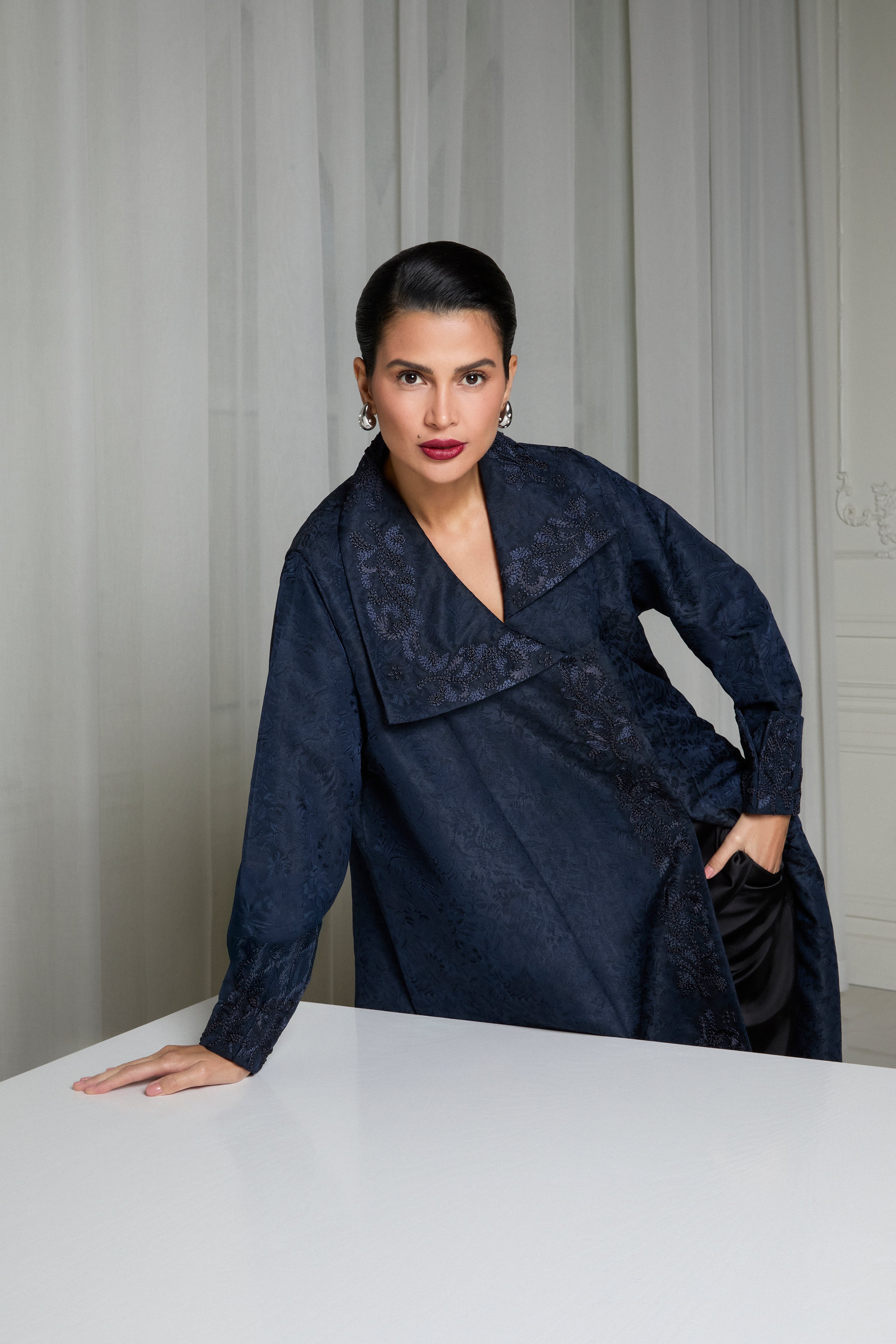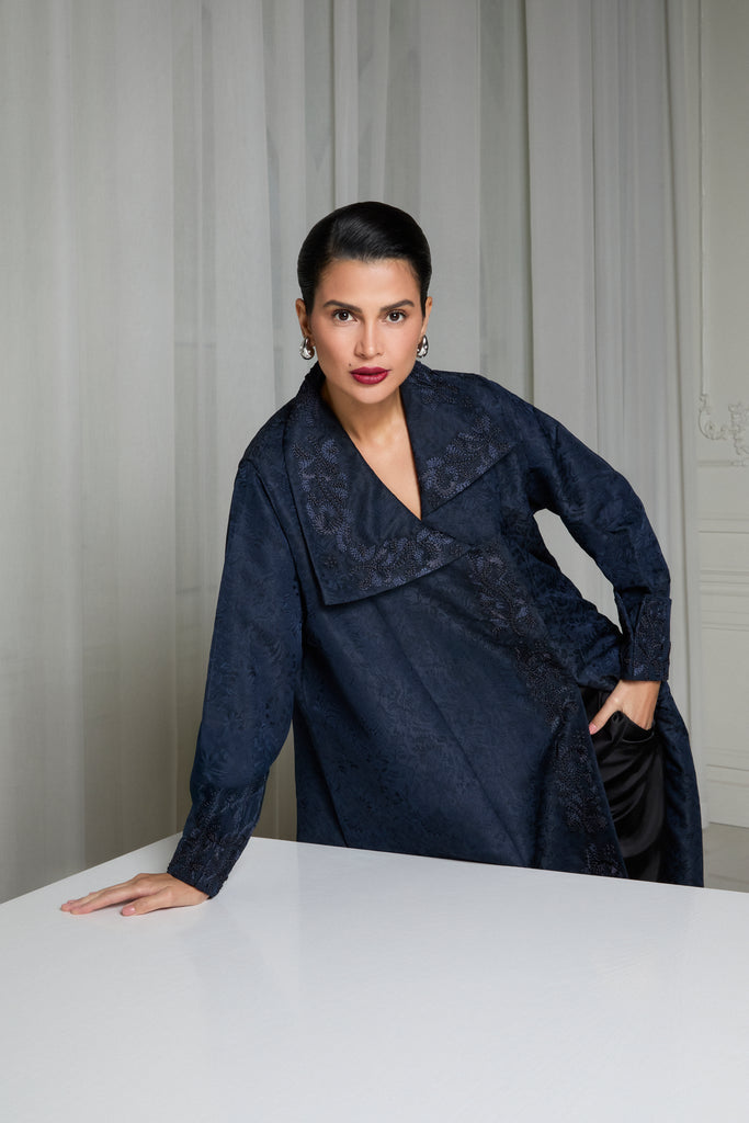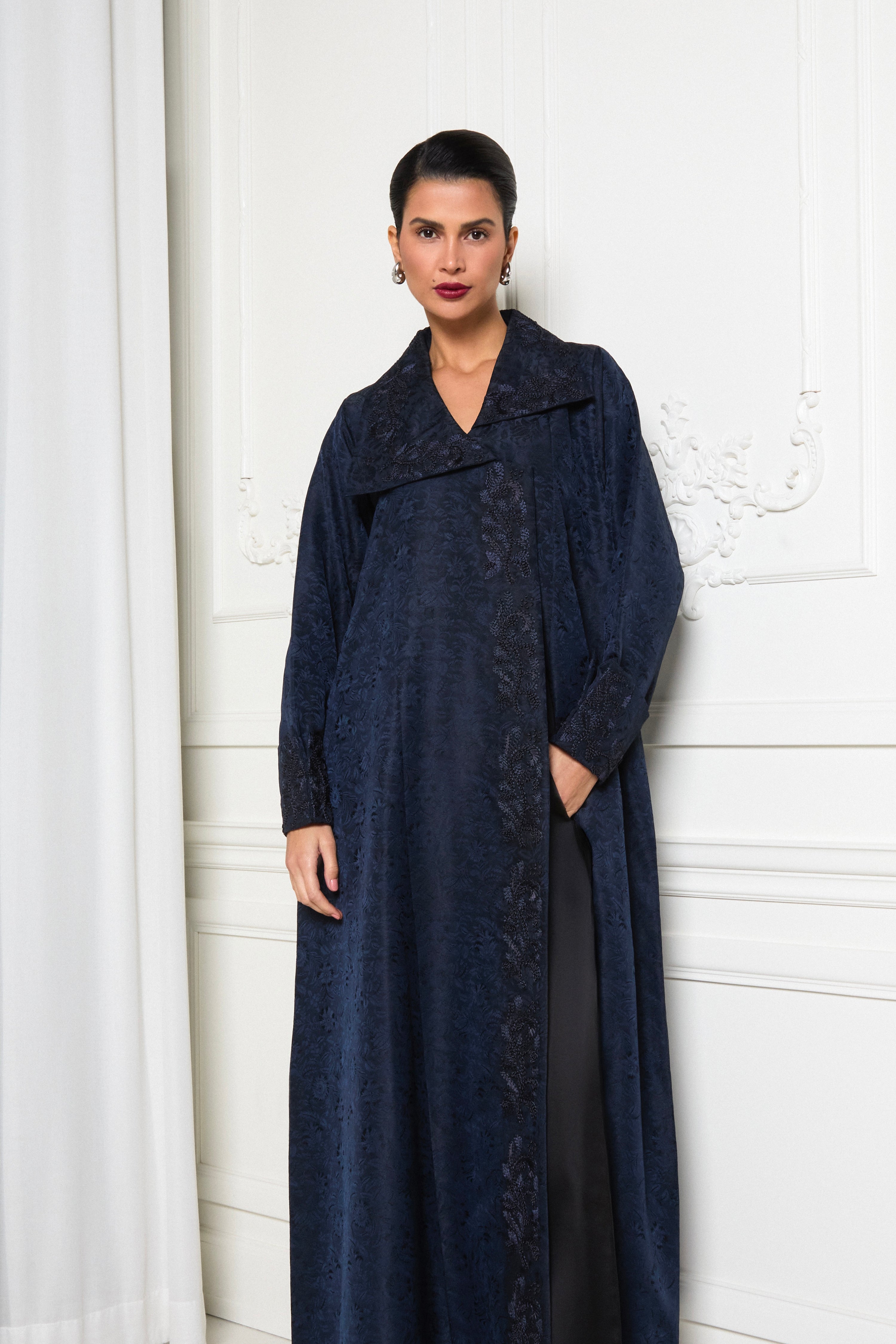 An elegant abaya crafted from floral jacquard linen, featuring a statement oversized front collar, adorned with intricate hand embroidery along the front and collar for a luxurious and refined finish.