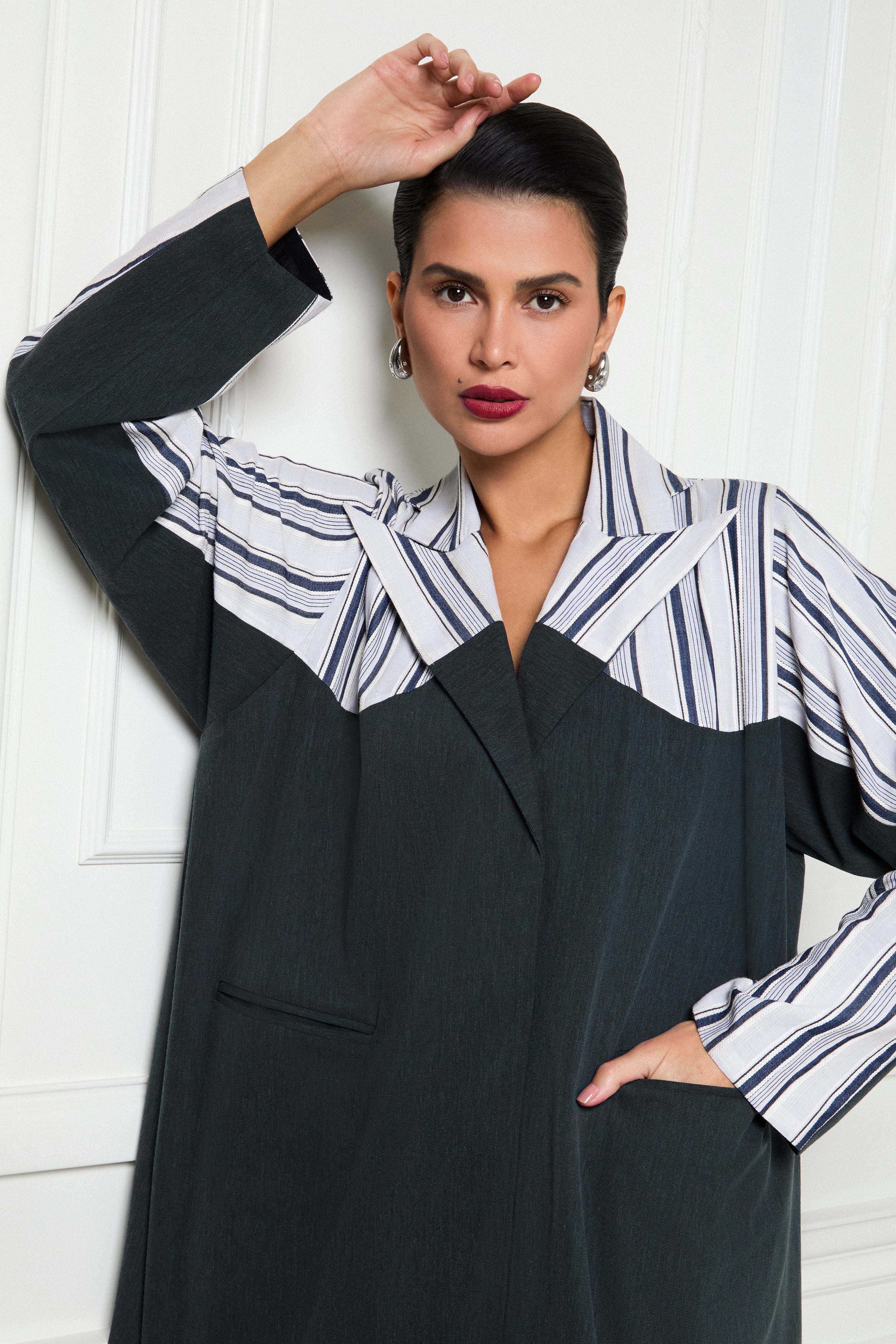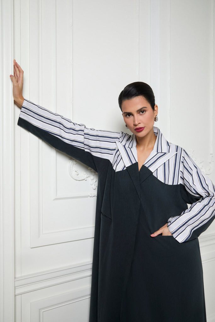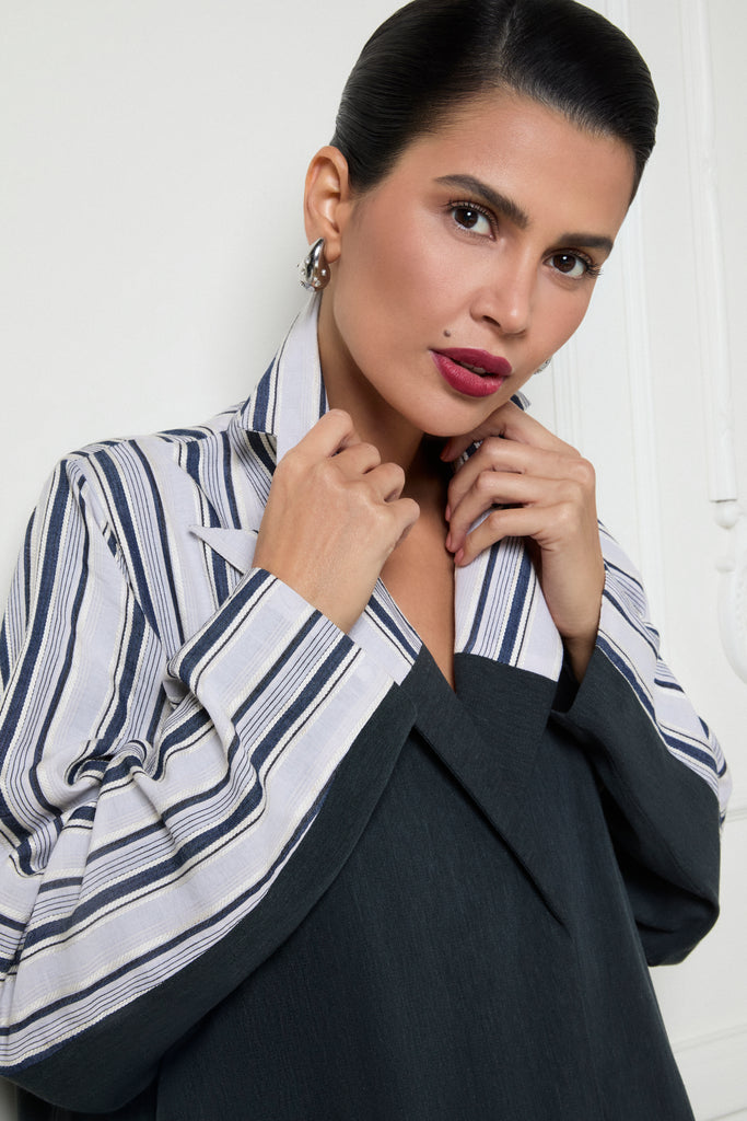 An elegant abaya crafted from blue-grey crepe fabric, designed for both style and comfort, featuring details of striped linen fabric on the sleeves and collar for a fresh and modern touch.