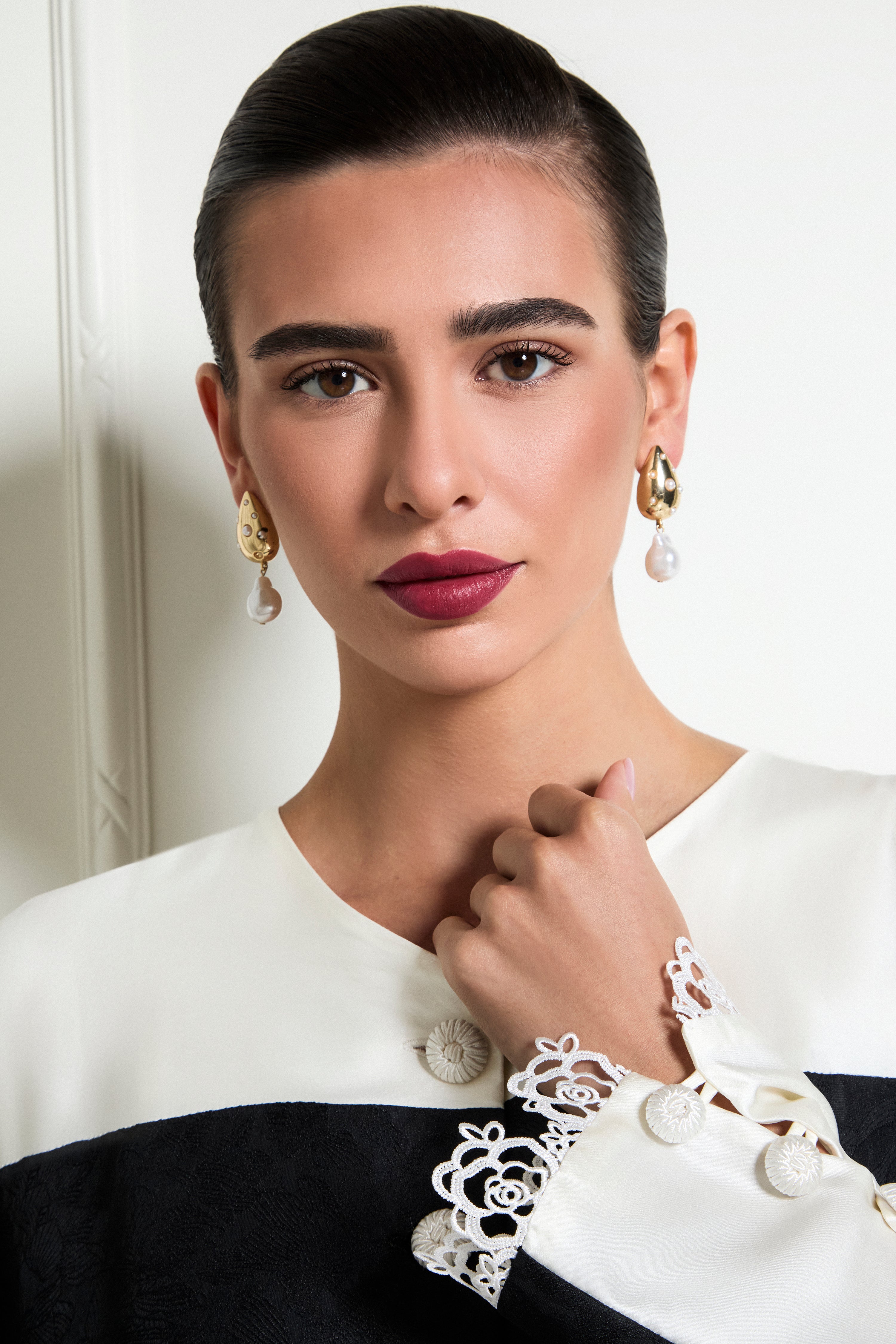 عباية من قماش الجاكار المشجر باللون الأسود، مع تفاصيل من الحرير الكريمي وأكمام مزينة بـ دانتيل ورود ناعم، وأزرار قماشية أنيقة بنفس لون الحرير الكريمي للمسة فاخرة وأنثوية.
