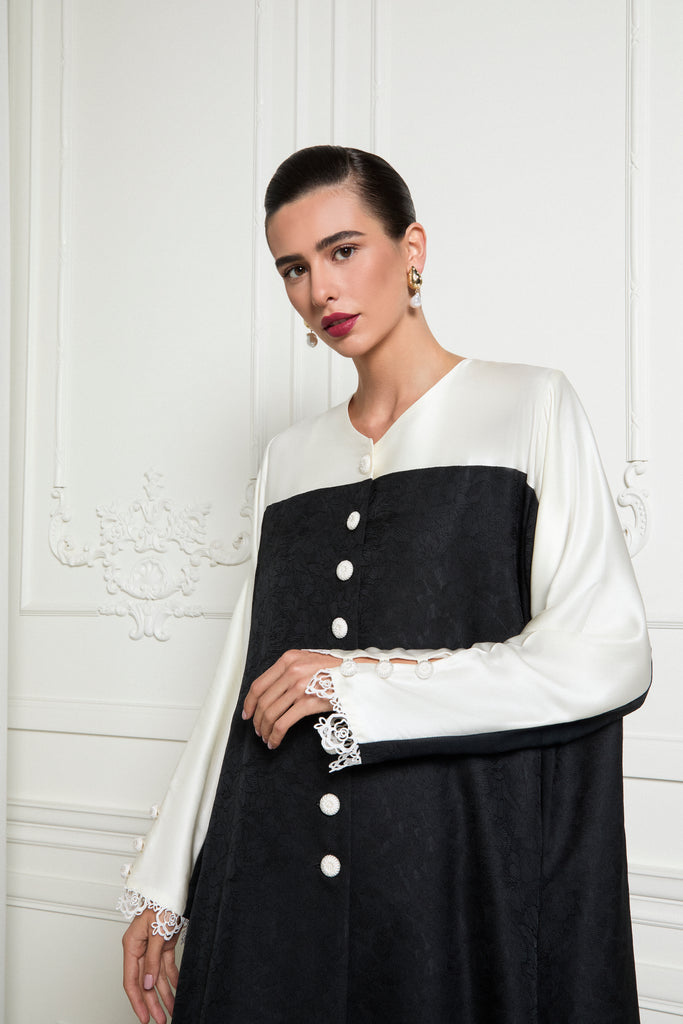 An abaya made from black floral jacquard fabric, featuring creamy silk details and sleeves adorned with delicate floral lace, finished with elegant fabric buttons in creamy silk for a refined feminine touch.